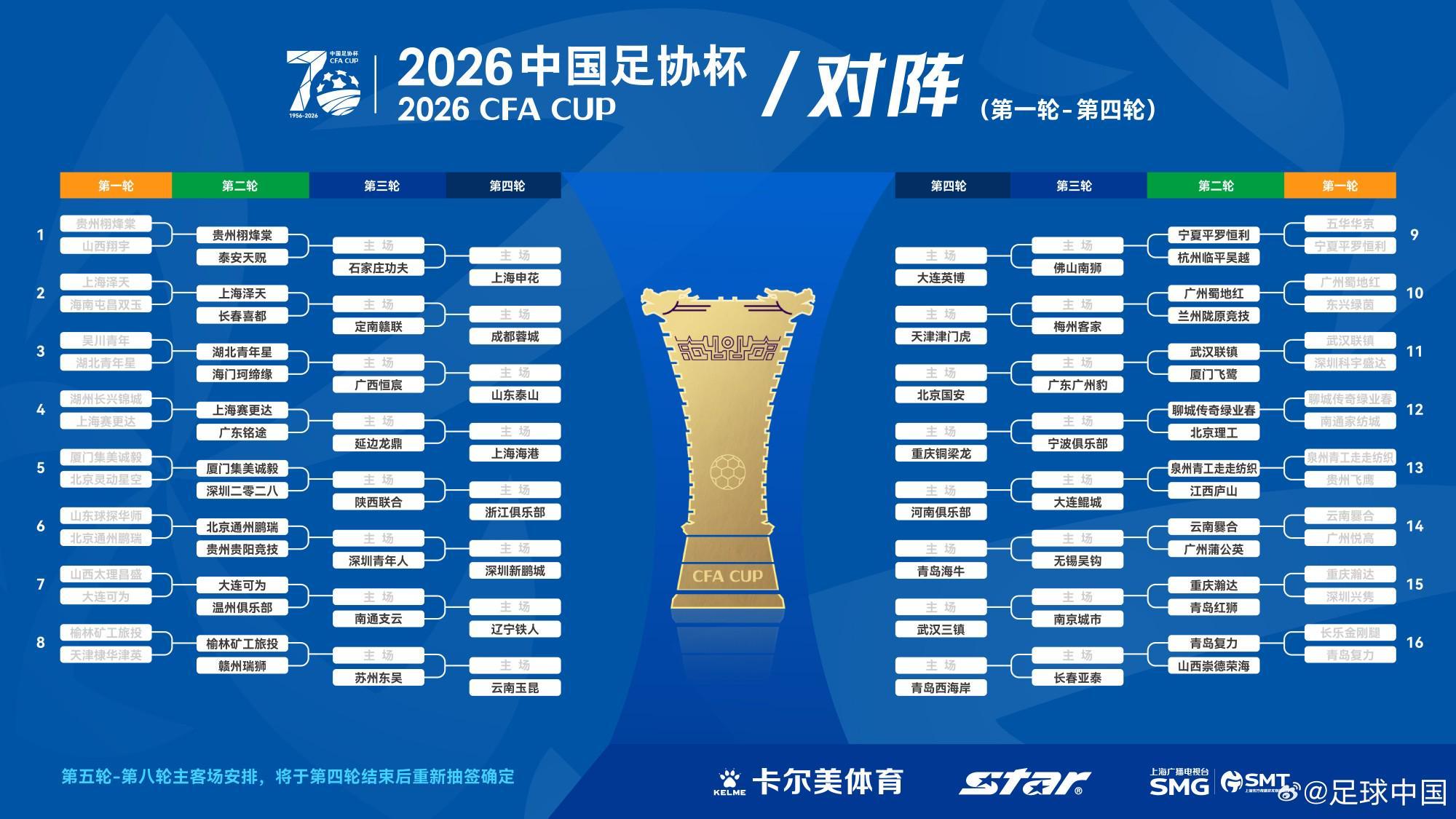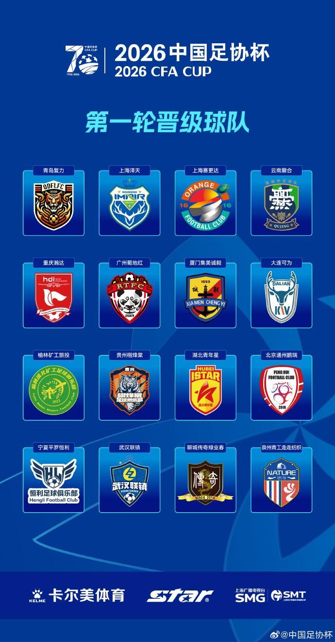 3月15日,2026中国足协杯首轮的赛事全面结束,16支晋级球队出炉,其中有13支是业余球队,3支是中乙球队。晋级的16支球队分别是:青岛复力、上海泽天、上海赛更达、云南爨合、重庆瀚达、广州蜀地红、厦门集美诚毅、大连可为、榆林矿工旅投、贵州栩烽棠、湖北青年星、北京通州鹏瑞、宁夏平罗恒利、武汉联镇、聊城传奇绿业春、泉州青工走走纺织。第二轮对阵情况如下图:...